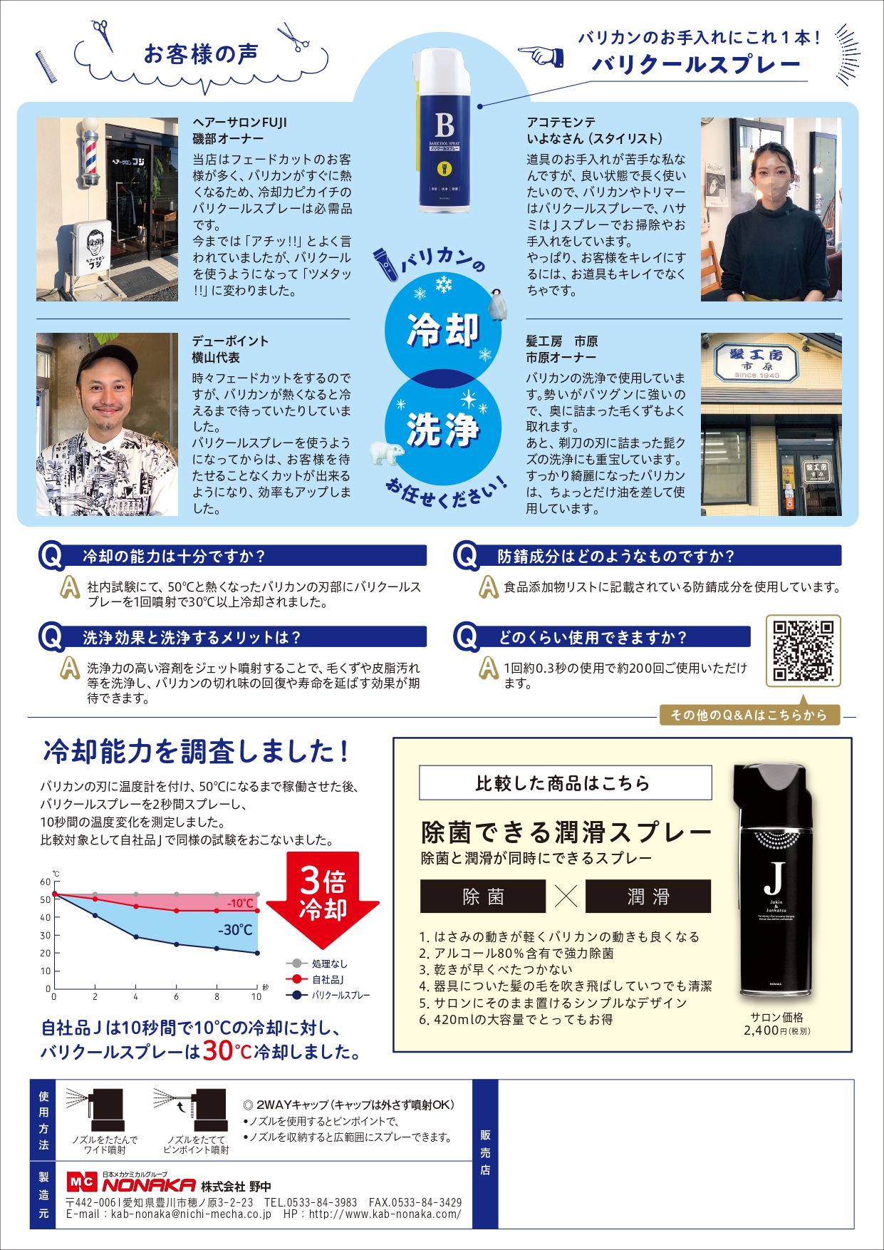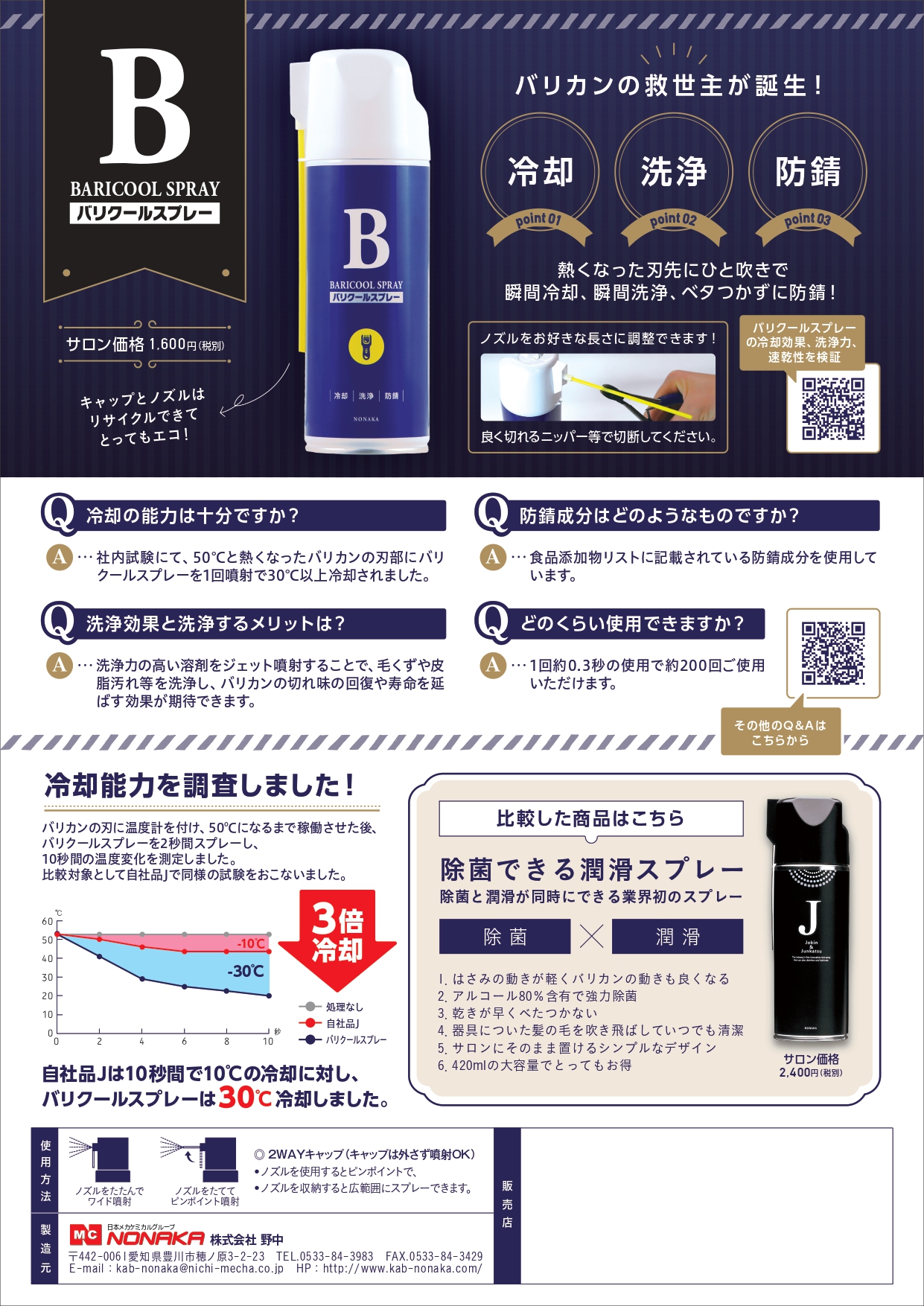 | 冷却 | 冷却の能力は十分ですか? | 社内試験にて、50°Cと熱くなったバリカンの刃部にバリクールスプレーを1回噴射で30°C以上冷却されました。(動画参照) |