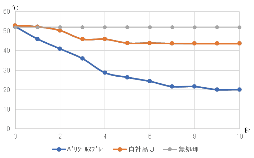 自社品J は10秒間で10℃の冷却に対し、バリクールスプレーは30℃冷却しました。