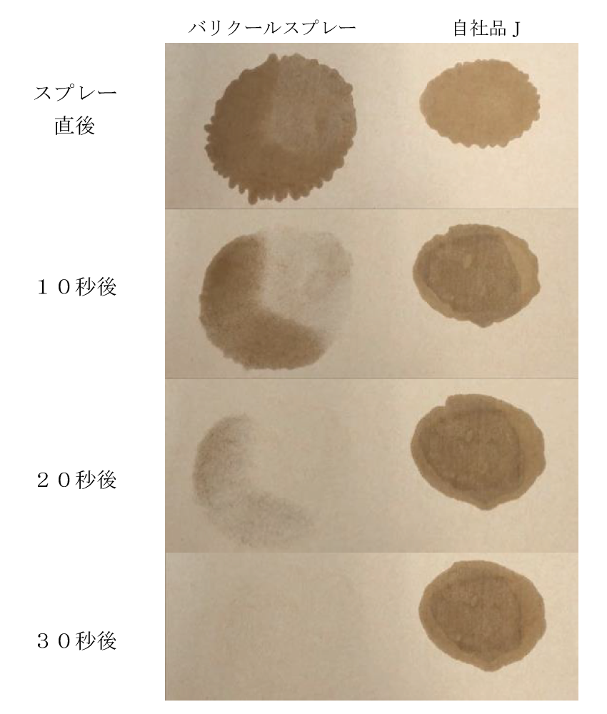バリクールスプレーは跡形なく乾燥したのに対し、自社品J はほとんど残留していました。