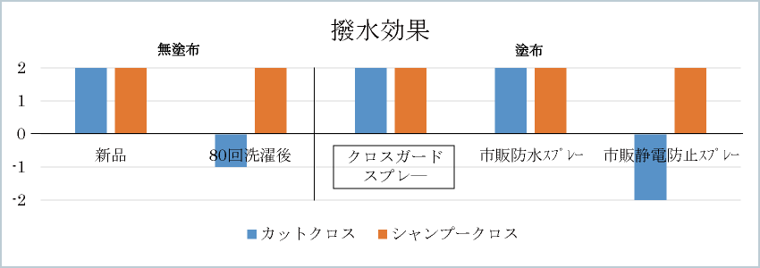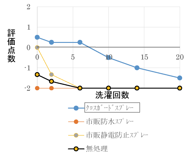 無処理のカットクロスの撥水・防水効果は洗濯20回前に、静電防止効果は洗濯5回前に評価点数0以下になりました。その中でクロスガードスプレーを塗布したクロスが洗濯20回後の撥水・防水・静電防止効果全てで最も良い評価点数を得ましたが、静電防止効果は洗濯20回前に評価点数0以下になりました。