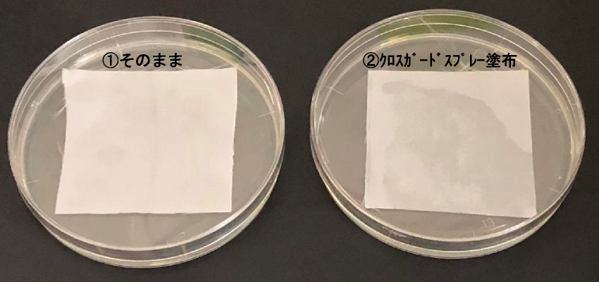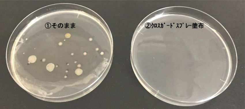 ①そのままのクロスで菌の発生が見られましたが、②クロスガードスプレーを塗布したクロスで菌の発生は見られませんでした。