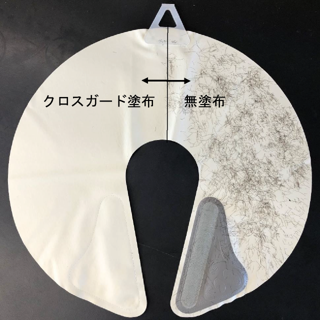 左半分にクロスガードを塗布、右半分は無塗布のネックシャッターを塩ビ棒でこすり、静電気を発生させてから髪の毛をのせ、はたいた後の髪の毛の残り具合を観察しました。