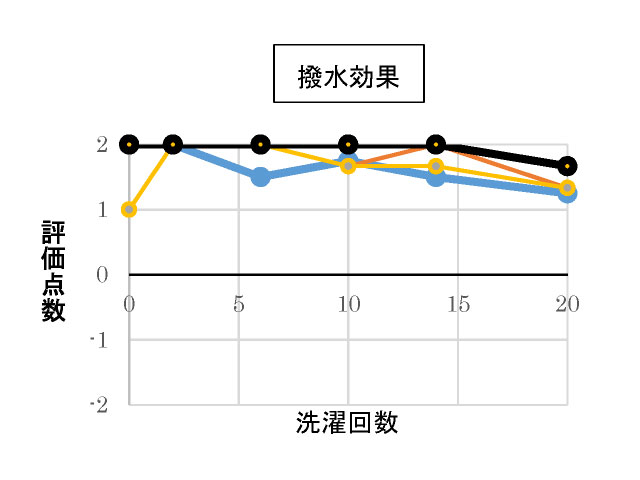 | 撥水効果 | ![]() 撥水しない | ![]() 弱い撥水 | わずかに撥水 | ![]() 撥水する | ![]() 強い撥水 |