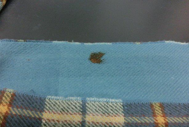 うすいブルーのカットクロスで、2か月前についたヘアカラー汚れですが色落ちもなく、カラー汚れだけがなくなりました。まさに魔法の液体ですね。