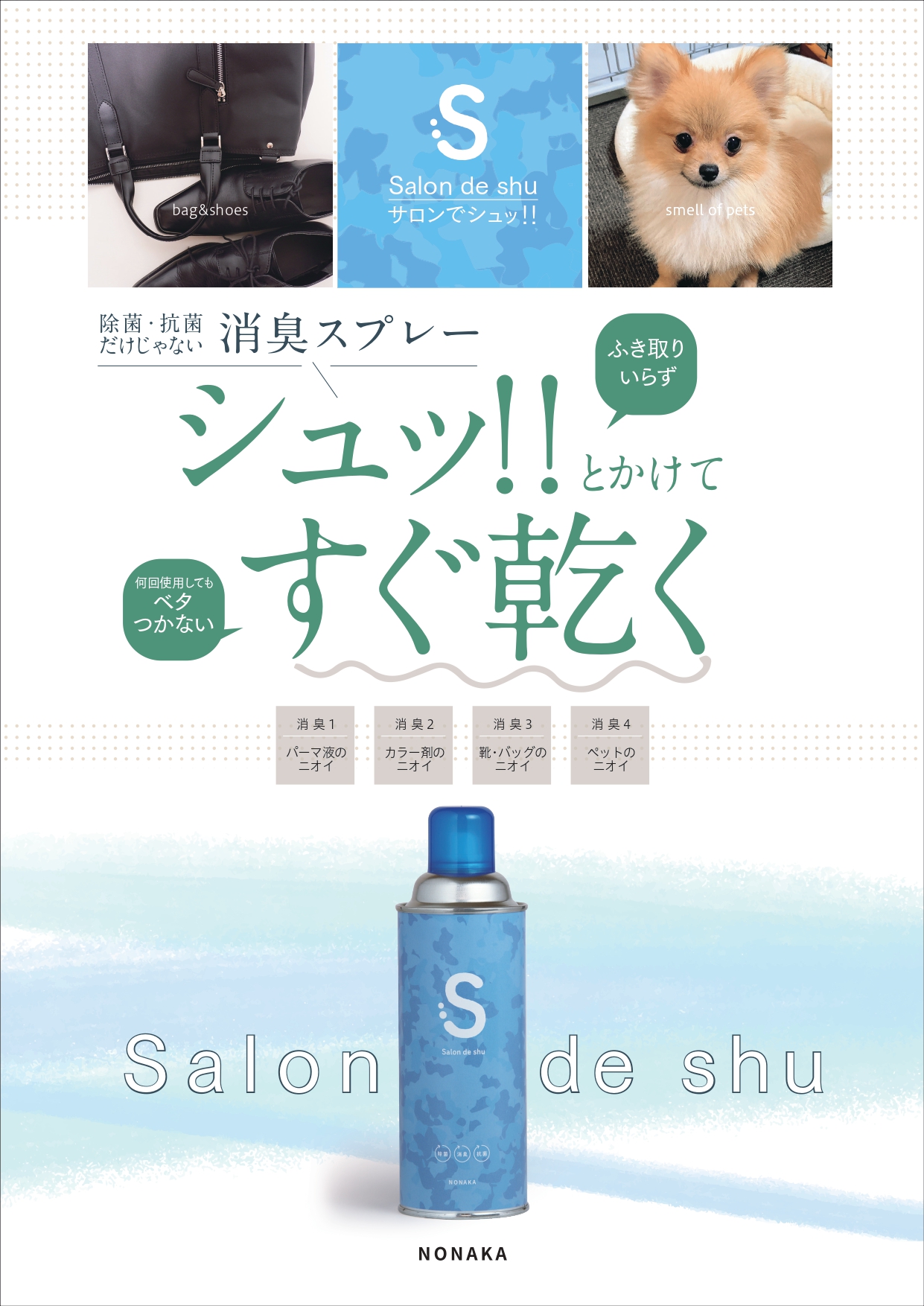 シャンプークロスは毎回濡れるので、どうしても生乾き臭が気になります。お客様を不快にさせないためにも首元にシュッ!!とひと吹きしています。すぐに乾くので、すぐに使用できるのがとても良いです。