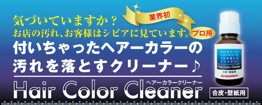 「理美容業界初」「プロ用」のヘアカラー汚れ用洗浄剤。合皮(椅子)や壁紙クロスに付着した汚れを落とすクリーナー